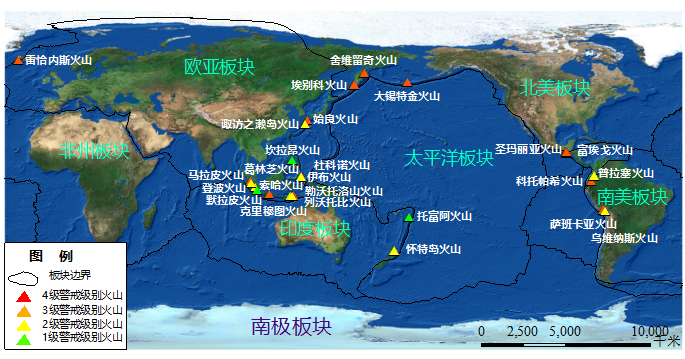本周2座火山处于四级警戒,11座火山处于三级警戒,9座火山处于二级警戒,3座火山处于一级警戒。