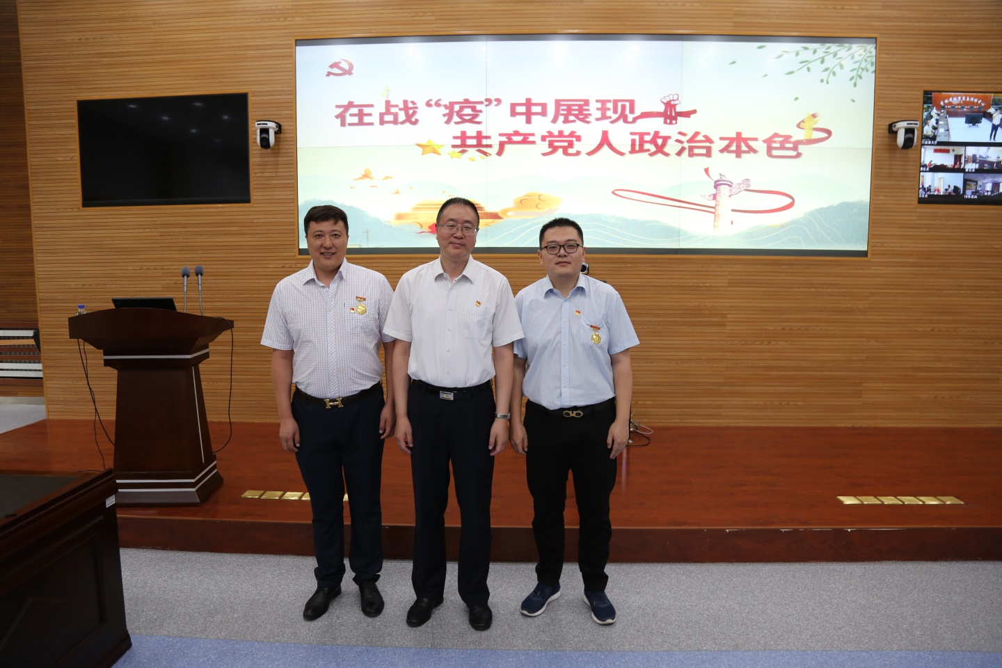 “我志愿加入中国共产党······”局党组书记、局长王建荣佩戴党员徽章,庄严举起右手,带领全体党员共同重温入党誓词,重温习近平总书记重要训词,动员广大党员不忘初心使命、奋发有为,坚定新时代防震减灾事业发展强大信心动力。亲自为党员志愿者突击队员米洪冬、徐卫同志颁发“抗击疫情纪念章”,对他们下沉一线、奋力战疫突出表现予以肯定,希望广大干部职工勇于发扬斗争精神,增强斗争本领,学习先进、争当先进。