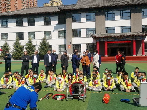 在培训展示现场,消防官兵和蓝天救援队队员模拟应急避难场所五个区域(指挥所、医疗区、物资区、供水区、供电区),向观摩领导和全校师生展示了心肺复苏、创伤救护(包扎)、防踩踏等应急救护科目,以及液压破拆工具组、无齿锯、移动照明灯、手抬机动泵、液压剪扩钳迷雾机、应急发电机等应急设备。随后邀请大家登上地震专业救援车辆,现场讲解车辆性能、用途、随车救援装备等方面知识并进行了现场演示,参观的小学生们对这样别开生面的演示十分好奇,不停追问相关问题,在得到大哥哥、大姐姐们的耐心讲解演示后,对于学到了大量的应急逃生救援知识感到十分开心,同时也加深了对地震抗震知识的学习效果。